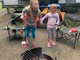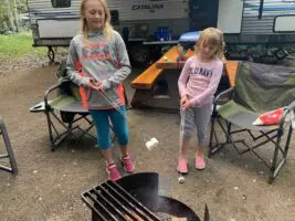 We headed back to camp, started a pot of coffee, lit the fire and roasted smokies for the girls for lunch. They headed down to the playground and we had mommy and daddy naps by the fire. Von can sleep anywhere—he just pulls down his hat and its lights out!
